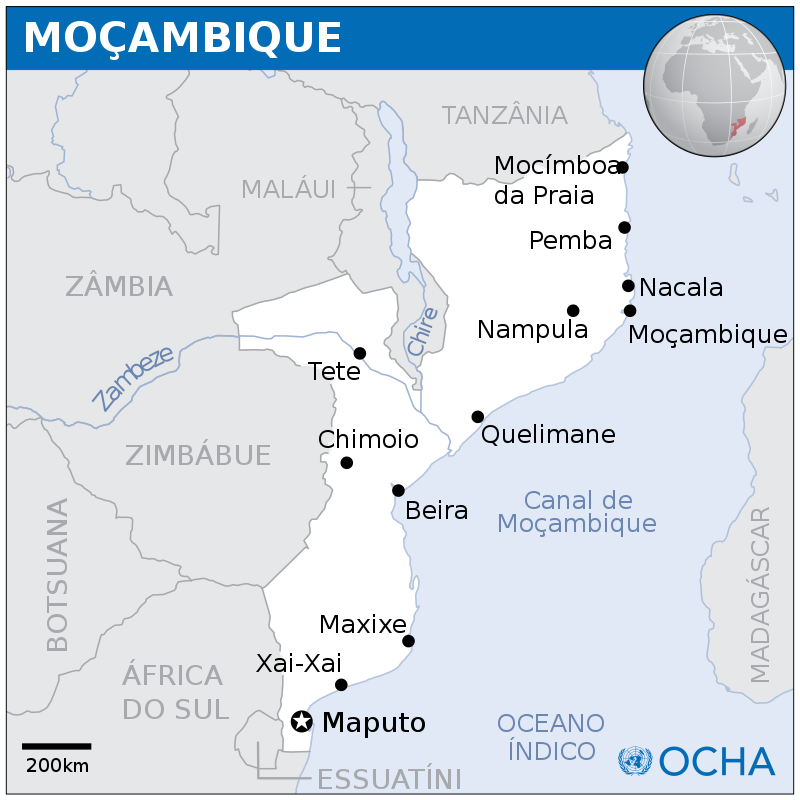 Moçambique está localizado na costa sudeste da África, fazendo fronteira com África do Sul, eSwatini, Zimbabué, Zâmbia, Malawi e Tanzânia, com uma costa de 2.700 Km no Oceano Índico.